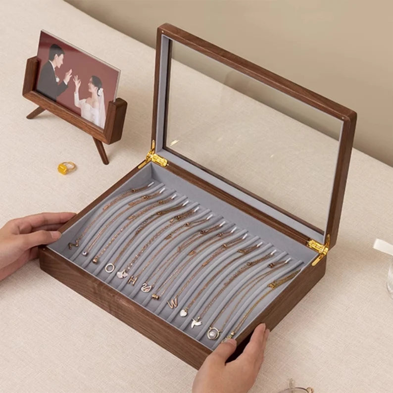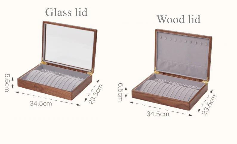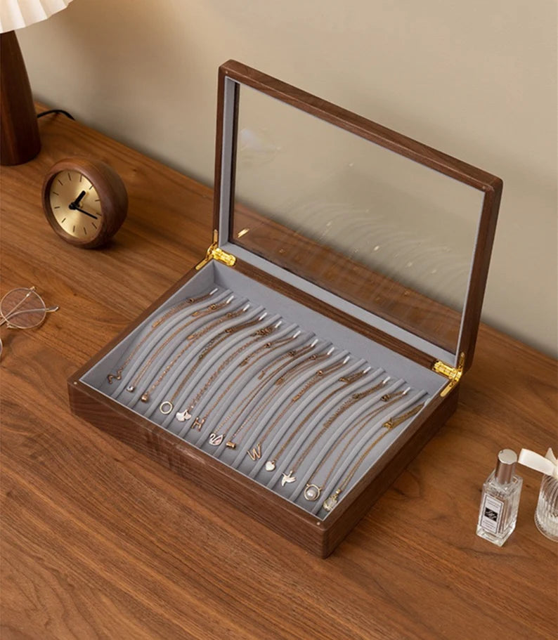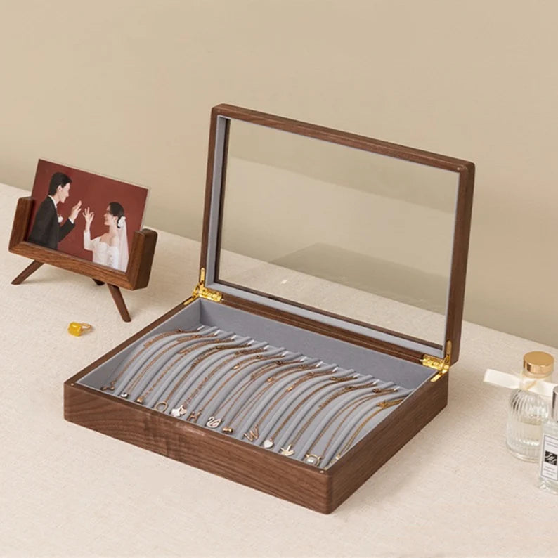 *"A stunning necklace box that looks beautiful on my dresser. The glass lid is perfect for displaying my favorite pieces, and the wood finish is gorgeous." - A Delighted Customer*