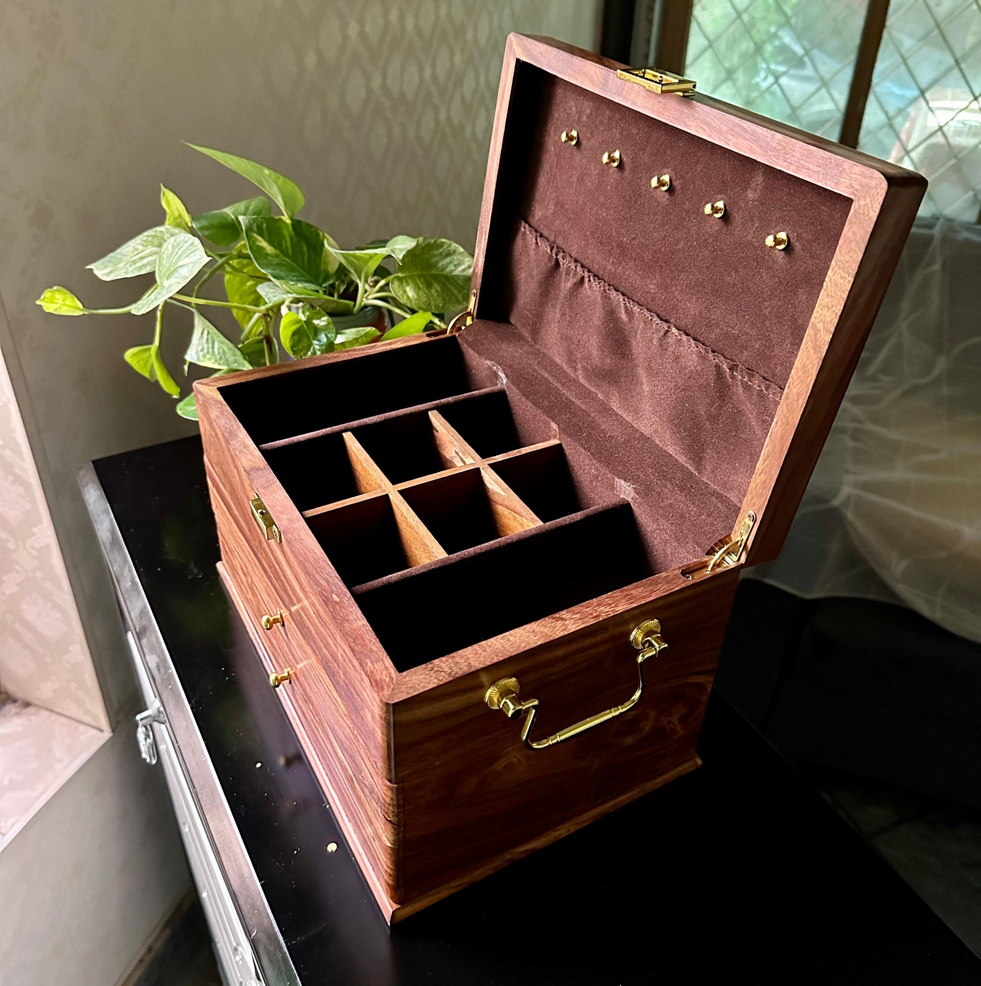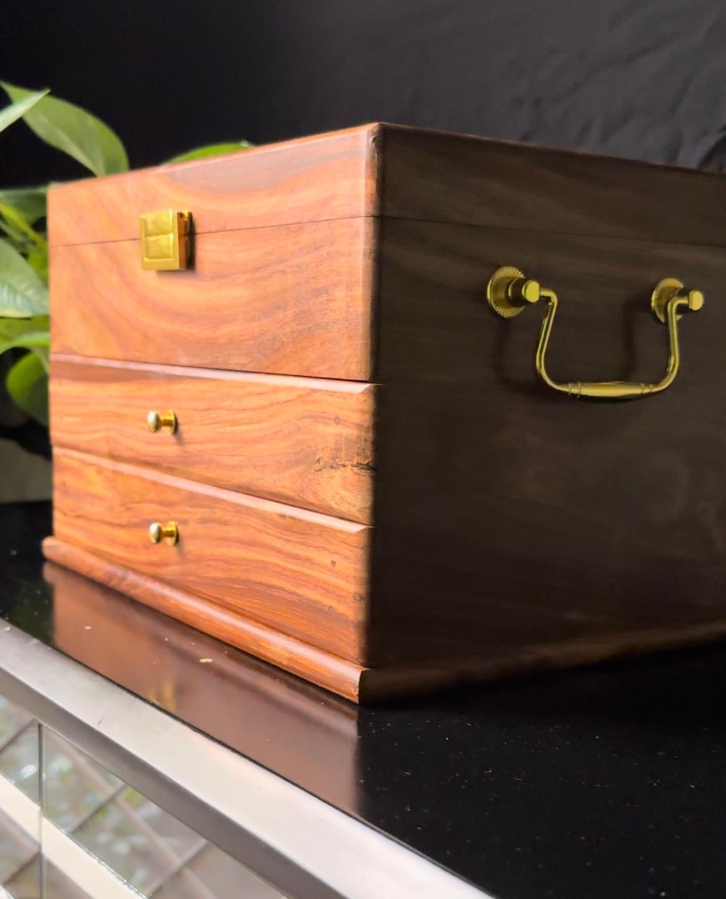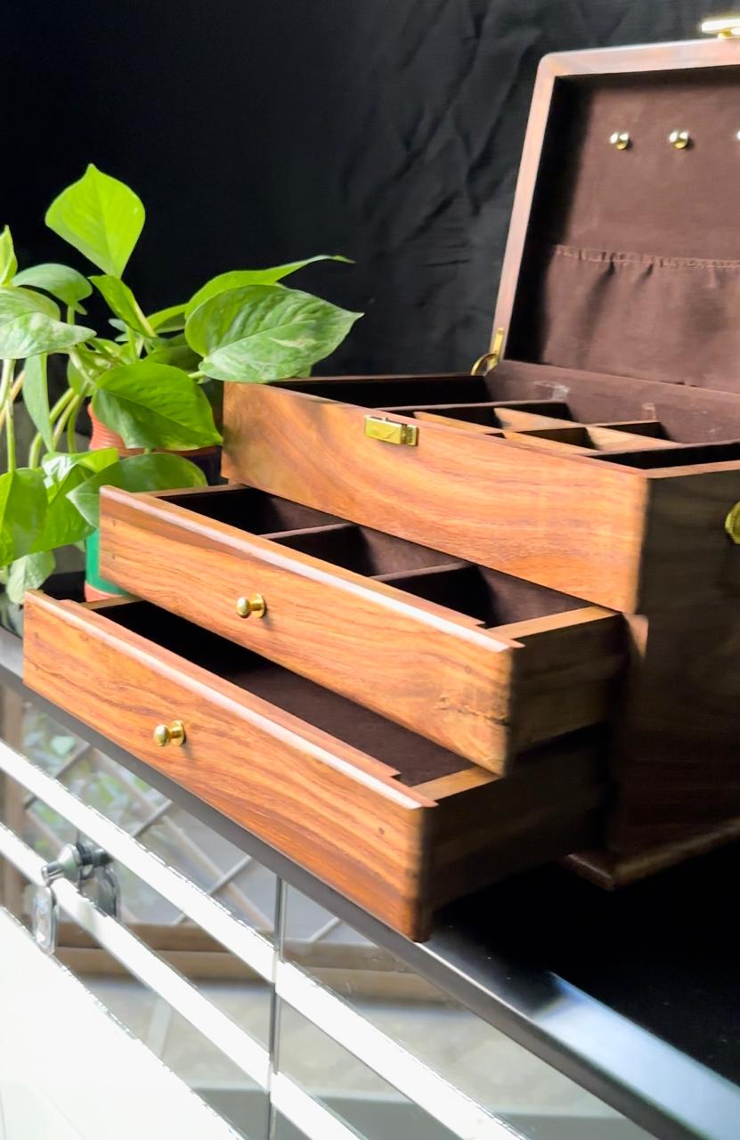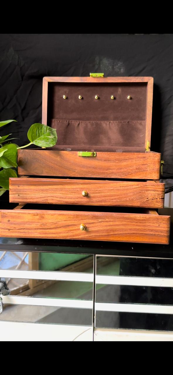 This wooden jewelry box is the perfect way to store and organize your favorite jewelry pieces. Made with sheesham wood, it is both beautiful and durable. It features drawers for smaller jewelry and a ring and earring ease. The necklace hanging bar makes it easy to select the perfect necklace for any occasion. With its classic design and fine construction, this box is sure to store and protect your jewelry for years.