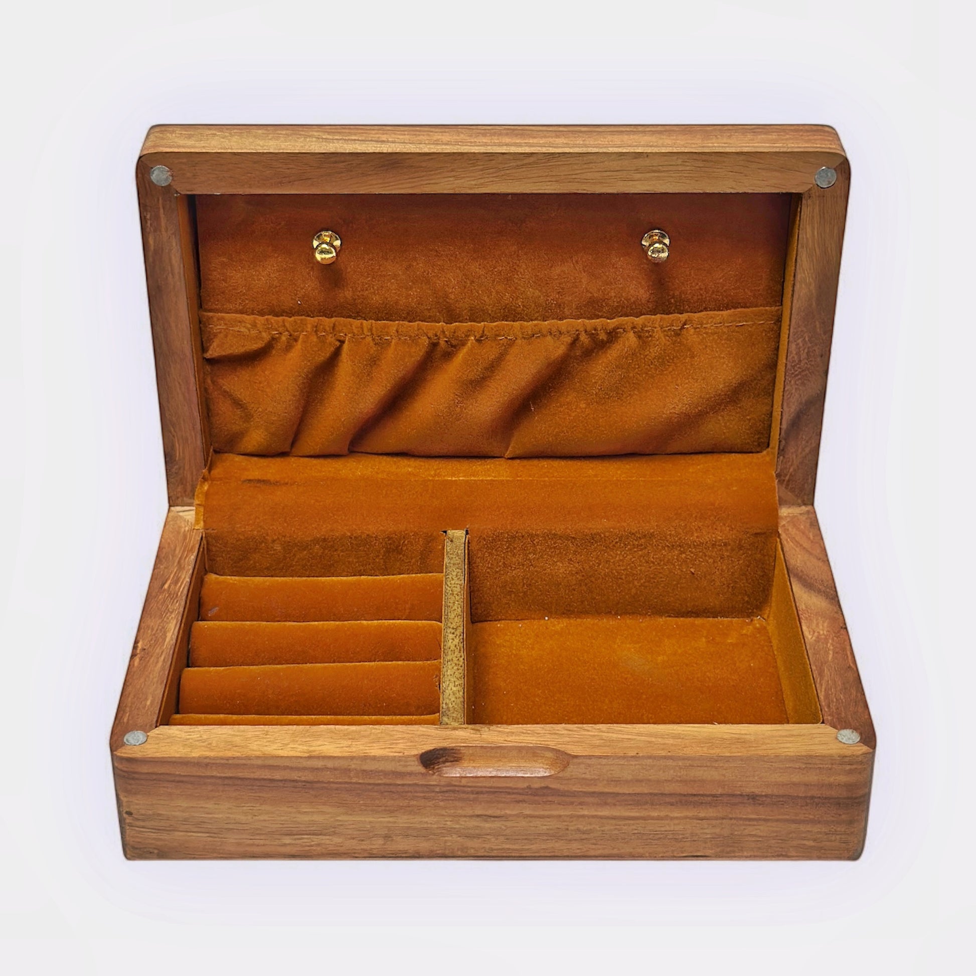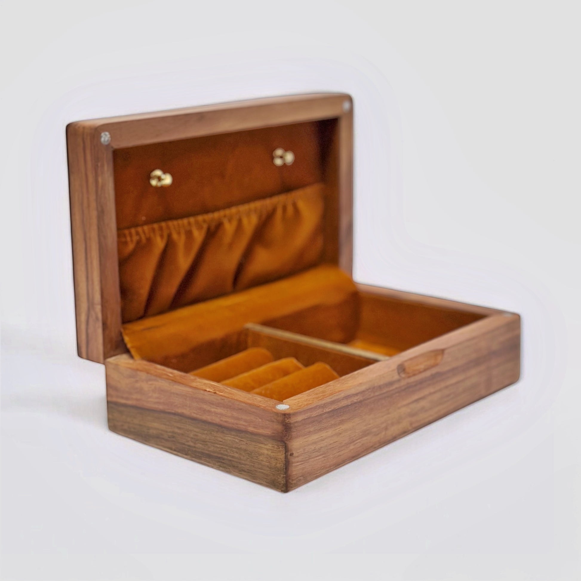 The Jewelry Travel Case is perfect for the organized traveler. Crafted from sheesham wood, this handmade item is personalized to ensure the perfect fit for your jewelry collection. Its perfectly sized compartments offer effortless access and are ideal for carrying your jewelry on your next trip. The perfect gift for any bridesmaid or jewelry enthusiast.