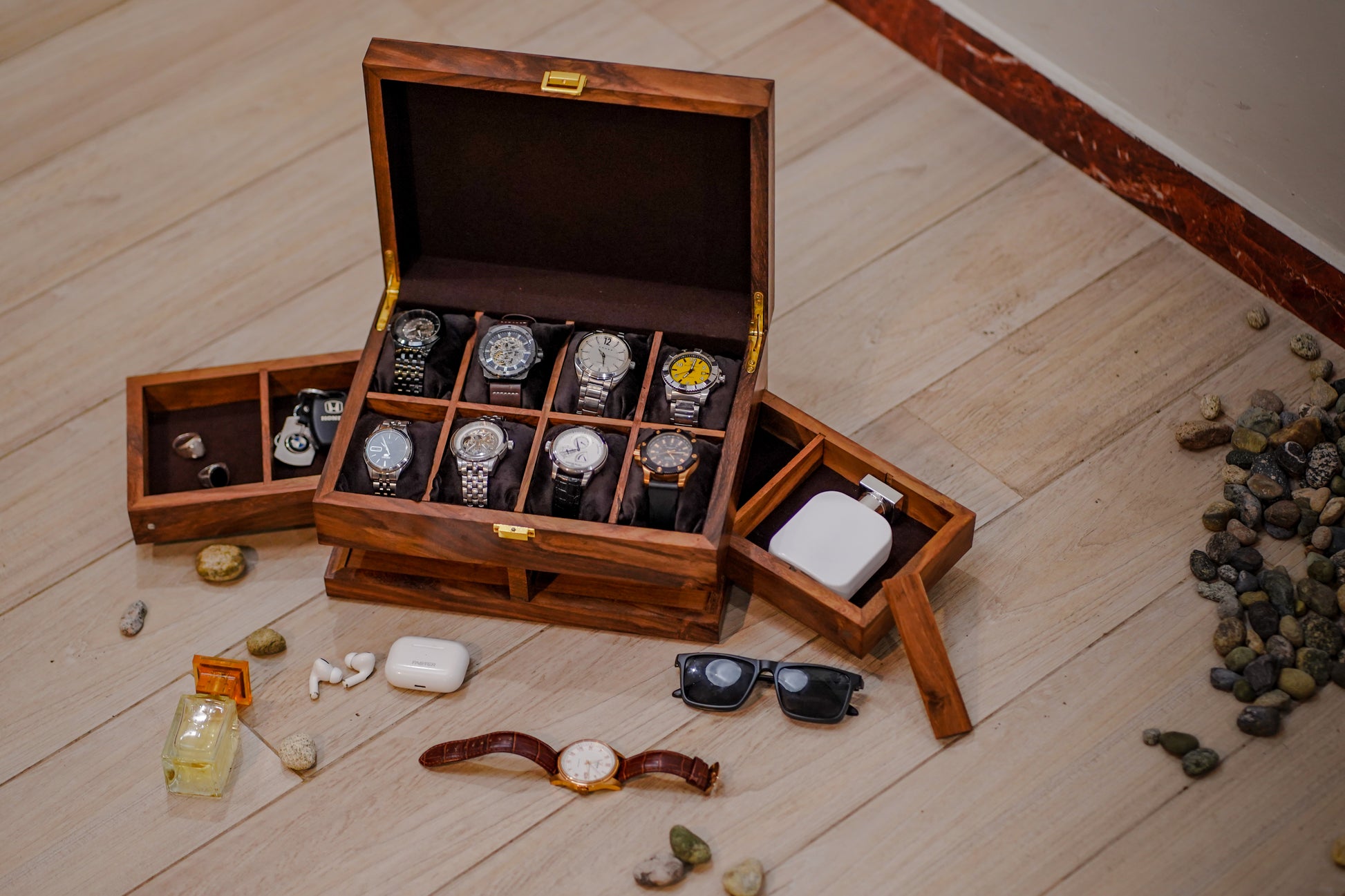 Store and protect your luxury watches in style with this handmade, beautiful watch box featuring natural Sheesham wood construction. Its luxurious design comes with spacious storage pillows and side compartments for a complete storage experience. Keep your watches safe and organized with this exquisite wooden watch box.