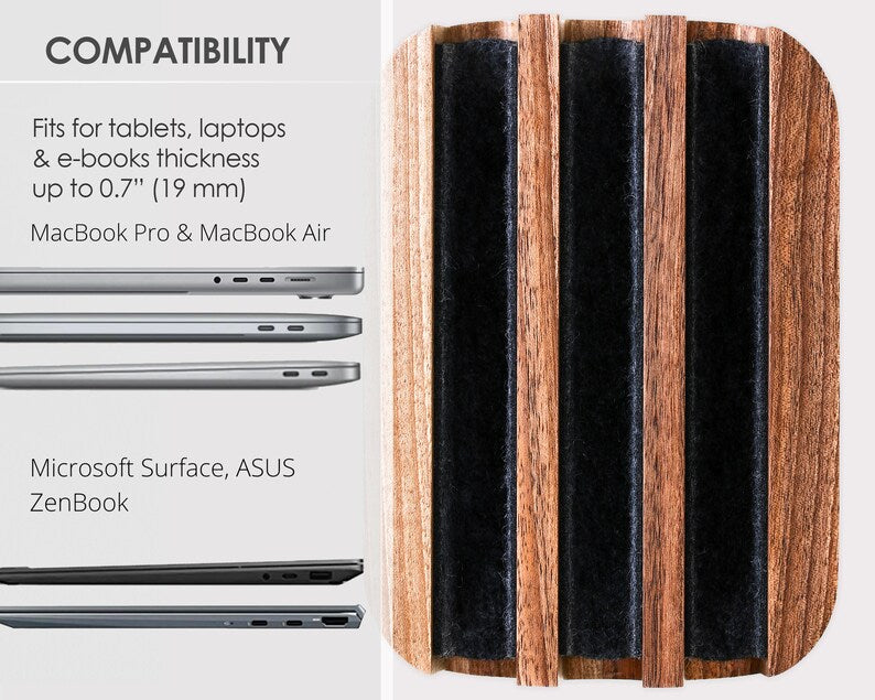 - Compatible with a wide range of laptops, including MacBooks, this stand is versatile enough to fit devices of varying thicknesses. The adjustable slots accommodate multiple laptops or tablets, making it a flexible storage option.