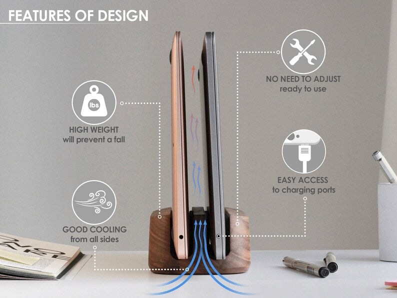 Maximize your workspace and keep your desk organized with our sleek Vertical Holder for Multiple Laptops. Designed to accommodate MacBooks and other laptops, this stand offers a space-saving solution that blends functionality with modern aesthetics.