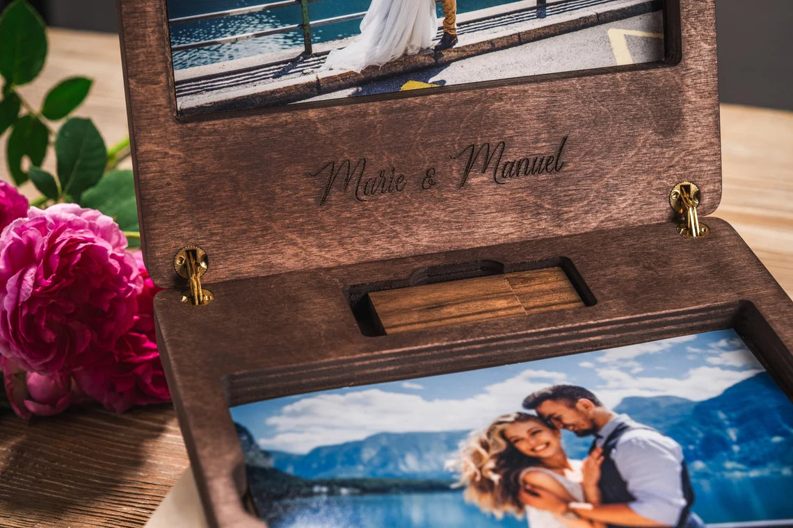 Make your wedding special with the Wooden Photo Box, a memorable article that adds life to your life. Crafted from durable and long-lasting wood, this photo box will preserve your memories for years to come. It keeps your USB safe too.